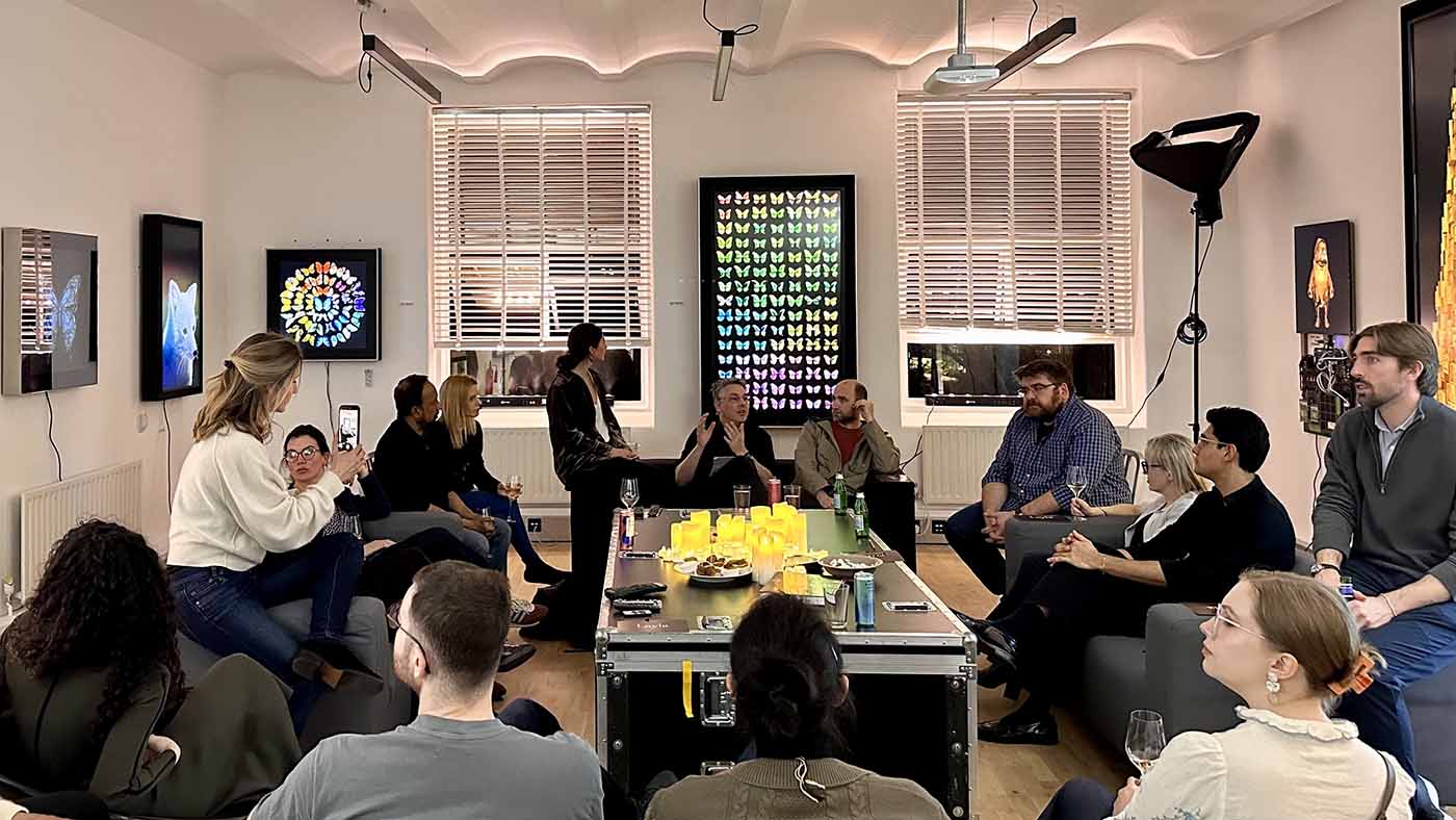 The event centred on a talk and Q&A, tracing a path from early studies at the Bartlett School of Architecture through to the sensor-driven, interactive works that now sit in private collections, museums, and institutions worldwide. Guests explored the studio's workshops and spent time with Sounds of Liberty — the real-time news artwork built on hand-painted digital butterflies, AI-synthesised voice, and live data — which served as a fitting backdrop for a wide-ranging conversation about technology, craft, and artistic intent.